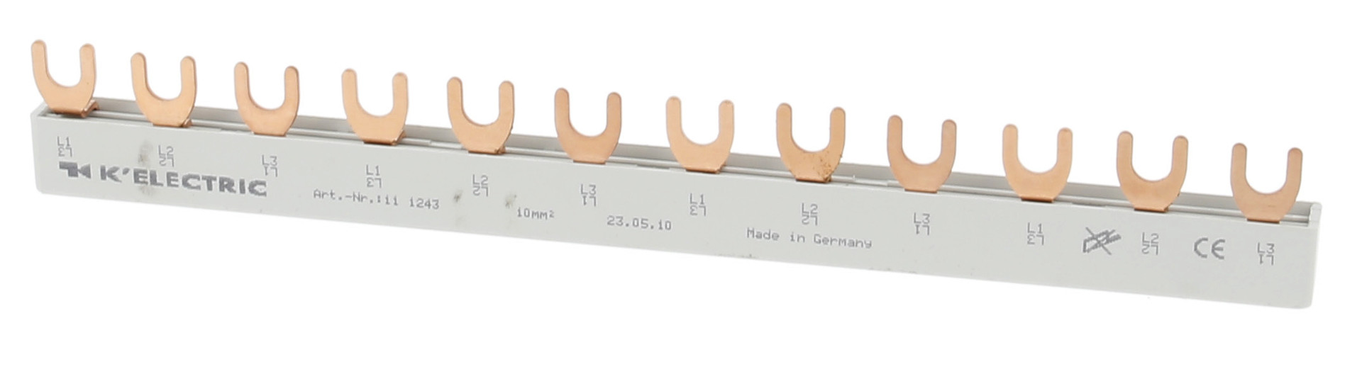 | Kurzbeschreibung | Gabel-Verdrahtungsschiene, 3-polig, 10mm², 12TE, zzgl. Metallzuschläge |