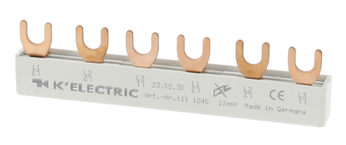| Kurzbeschreibung | Gabel-Verdrahtungsschiene, 3-polig, 10mm², 6TE, zzgl. Metallzuschläge |