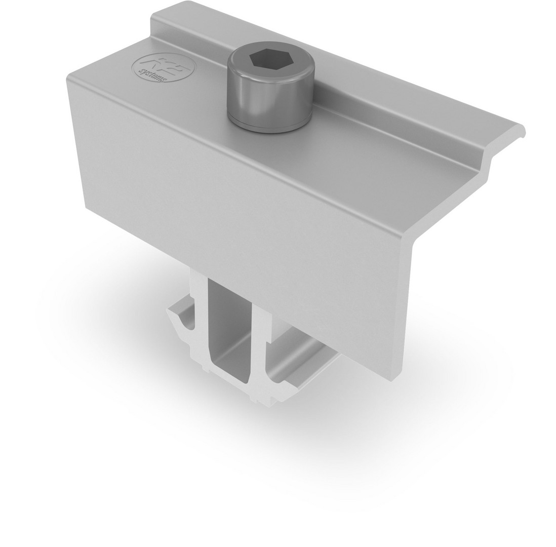 Modulendklemmen Set zur Befestigung von Solarmodulen auf dem K2 Dome System. Material: Aluminium EN AW 6063 T66; EN AW 6082 T6, Edelstahl (1.4301).