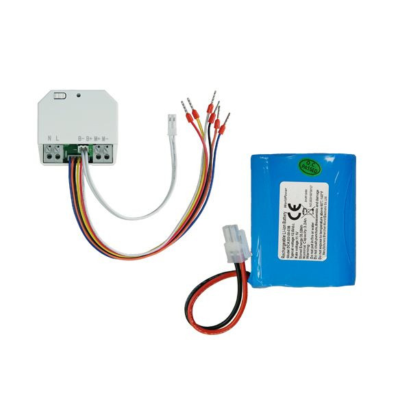 Diese Rollladen- u. Raffstoresteuerung für den 2. Rettungsweg sorgt dafür, dass Sie selbst im Fall eines Stromausfalls den angeschlossenen Antrieb noch fahren können. Häufig kommt es im Brandfall bereits kurz nach dem Ausbruch des Feuers zu einem hausweiten Stromausfall, welcher das Bedienen von nicht-akkugepufferten Antrieben unmöglich macht. Um ständig den 2. Rettungsweg freizuhalten haben wir diese intelligente Steuerung mit Stützakku entwickelt. Im Normalbetrieb wird der angeschlossene Akku ständig über das Modul geladen. Sobald der Strom ausfällt, lässt sich der Motor zunächst wie gewohnt bedienen. Ab einer Akkuladung von 30% gibt die Steuerung bei jeder Betätigung einen Signalton aus, um zu signalisieren, dass der Akku nicht mehr geladen wird. Fällt die Akkuladung weiter auf 10% führt das Modul nur noch Fahrten in die Laufrichtung AUF aus, um zu garantieren, dass der Rollladen bzw. die Jalousie im Notfall immer geöffnet werden kann. Der Akku wird ständig vom Modul überwacht. Nach 2 Jahren oder 1000 Hüben sollte der Akku geprüft und ggf. getauscht werden. Das Modul signalisiert dies durch einen Alarm (Signalton im 30-Sekunden-Intervall), welcher per angeschlossenem, unverriegeltem Schalter für 24 Stunden deaktiviert werden kann. Das Modul bietet Anschlussmöglichkeiten für 2 potentialfreie Bedienungen. Die Vor-Ort-Bedienung schaltet das Modul nach einem Tastbefehl in eine 120-sekündige Selbsthaltung. Die Zentralbedienung läuft im Totmannbetrieb und kann beispielsweise auch an potentialfrei schaltende Rauchmelder angeschlossen werden. Kombiniert werden kann die Steuerung mit 12V-Rollladen- oder -Jalousieantrieben (z.B. Art.-Nr. 112030 oder 148050). Die maximale Schaltleistung des Moduls und der Batterie liegt bei 5 Ampere. Das Paket enthält das Steuerungsmodul sowie den neuen Akku in besonders kleiner Bauform. Die beiden Bauteile sind konzipiert für den Einsatz in einer UP-Electronicdose. Die Kabel vom Akku zum Modul können mit der angeschlagenen Steckverbindung einfach verbunden werden. Die Kabellänge beträgt 150mm. Die Versorgungsspannung beträgt 230V (50Hz). Abmessungen Modul: 48x45x23mm, Abmessungen Akku-Pack: 70x55x18mm