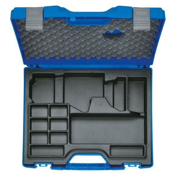 Kunststoffkoffer blau 357 x 305 x 95 mm geeignet für Transport für elektromechanisches Werkzeug Klauke micro (wie z.b EKSD50ML). Fach für ein Werkzeug, zwei Akkus 10.8 V Klauke, ein Schmiermittel,kleinteiliges Zubehör (wie z.b SD50CS) ,ein Ladegerät und mindestens 6 Absioliereinsätze (z.b SD5006) oder 12 Presseinsätze der Serie ?50?. Deckelinnenseite mit Schaumstoff für festen Halt aller Bestandteile. Koffer schützt Akku vor Bewegungen.Ergonomischer Griff. Koffer nicht abschließbar. Stapelnocken für sicheres und stabiles Aufeinanderstapeln. Abgerundete Ecken schützen empfindliche Oberflächen vor Beschädigungen.