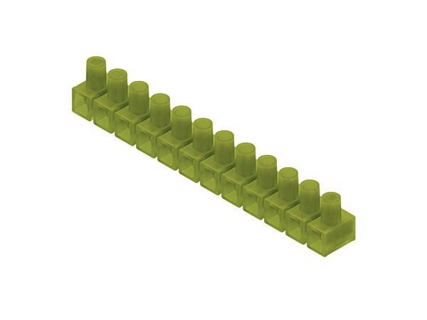 Verbindungsklemme nach DIN EN 60998, mit 12 abtrennbaren Klemmstellen, halogenfrei. Abmessungen (ca. Maße) H x B x L : 17,5 x 15 x 122 mm Klemmbereich eindrähtig, starr, flexibel : 1,5 - 4,0 mm² Anschlussmöglichkeiten eindrähtig : 5 x 1,5 mm², 4 x 2,5 mm², 2 x 4,0 mm² Anschlussmöglichkeiten starr, flexibel : 4 x 1,5 mm², 3 x 2,5 mm², 2 x 4,0 mm² Werkstoff Isolierteil : PA Werkstoff Klemmbolzen : Messing Werkstoff Klemmschrauben : galvanisch verzinkter Stahl Max. Umgebungstemperatur nach EN 60998 : T85 Nennspannung : 450 V Farbton : gelbgrün