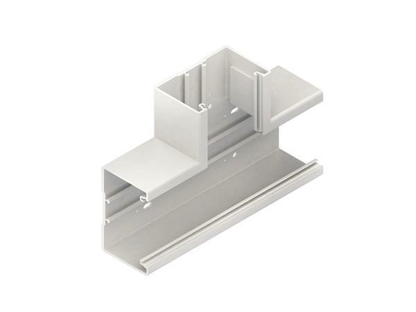 Gerätekanal-T-Stück 90°, einzügig, symmetrisch, mit zwei durchgehenden Aufnahmeprofilen im Rückenteil sowie durchlaufender Perforation im Kanalrücken, einschließlich drei Kanalkupplungen KUV, Stoßstellenverbinder BSV65 zur exakten Verbindung mit dem Kanalunterteil bitte gesondert bestellen. VDE zertifiziert! Abmessungen (ca. Maße) H x T : 105 x 66 mm Haupt- und Abgangsquerschnitt Deckelöffnung : 80 mm Länge in Hauptrichtung : 250 mm Länge in Abgangsrichtung : 165 mm für Gerätekanalunterteil : BU651058... Werkstoff : PVC-hart (Polyvinylchlorid) Farbton : lichtgrau RAL : 7035 (ähnlich)
