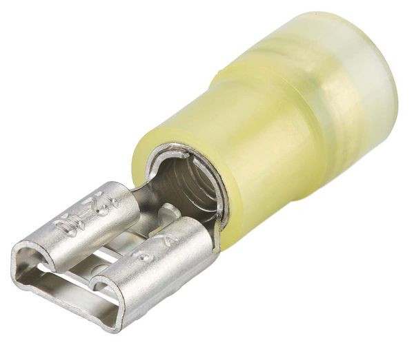 97 99 022 Flachsteckhülsen Werkstoff: Messing, verzinnt. Isolation: Nylon. Max. Temperatur: 105 °C. Max. elektrische Belastung: 600 V. Inhalt: 100 Stück. Kennfarbe: gelb. Kabel 4 – 6mm² AWG 12 — 10 Kennfarbe gelb Menge 100 Isolation Nylon Werkstoff Messing Oberfläche reinverzinnt Max. Temperatur 105°C Max. elektrische Belastung 600 V Steckerbreite 6,3mm