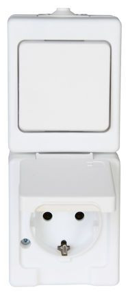 STANDARD - Aufputz Feuchtraum Aus-/Wechselschalter-Steckdosenkombination, senkrecht, Nennstrom 16A, Bemessungsspannung 250V~, Schaltvermögen 10AX, Schutzart IP44, Farbe: arktisweiß