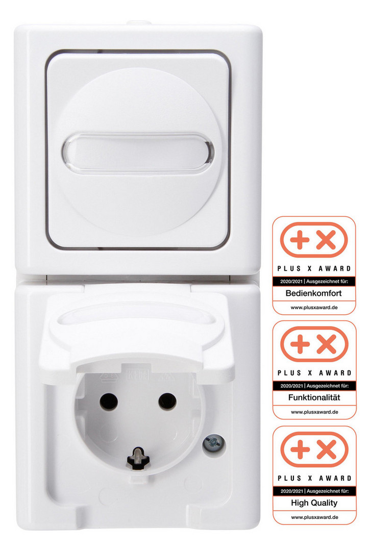 BLUE ELECTRIC - Aufputz-Feuchtraum, Universalschalter (Aus/Wechselschalter) und Steckdosenkombination, mit Beschriftungsfeld, senkrecht, 10AX/16A, 250V~, Schutzart IP44, Farbe: arktisweiß
