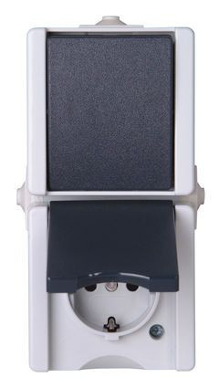 proAQA - Aufputz-Feuchtraum Aus-/Wechselschalter-Steckdosenkombination in senkrechter Ausführung, ohne erhöhten Berührungsschutz, Bemessungsspannung 250V~, Schaltvermögen des Schalters 10AX, Nennstrom der Steckdose 16A, Schutzart IP44, Farbe: grau