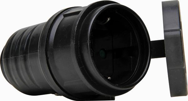 TPE-Schutzkontakt-Kupplung mit Klappdeckel, mit Knickschutz, bruchfest, Einsatz: Polyamid, für Kabelquerschnitt bis 3x1,5mm², 16A, 250V~, Schutzart IP44, Farbe: schwarz