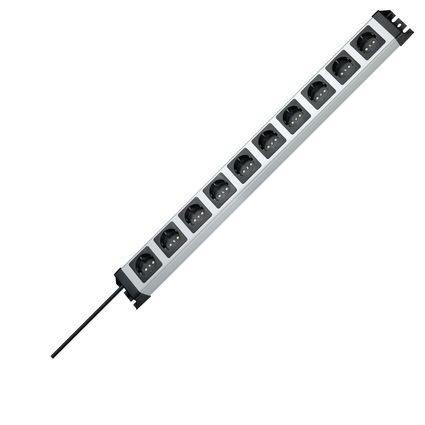 POWERversal 10-fach, erhöhter Berührungsschutz, 90°gedrehte Töpfe, 65mm Topfabstand, anschraubbar, wiederanschließbar, 1,4m Zuleitung H05VV-F3Gx1,5mm², Maße(lxbxh): 742,8x71x58,3mm, 16A, 250V~, max. 3600W, Schutzart IP20, Farbe: silber-schwarz