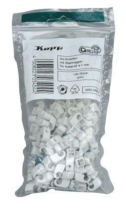 | Kurzbeschreibung | Iso-Nagelschellen, 5-7mm, mit gehärteten 20mm-Stahlstiften, grau, 100 Stück |