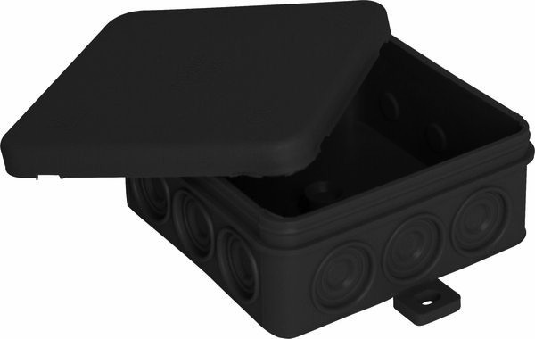 Feuchtraum Aufputz-Abzweigdose, winddicht, 80x80x37mm, mit Durchstoßmembrane an allen vier Seiten sowie auf der Rückseite, für Kabel 7x1,5mm²/5x2,5mm², IP55, montagefreundlich, einfache Handhabung ohne Zusatzwerkzeug, Material Gehäuse: PP/TPE, Material Deckel: PE, verlustsicherer Deckel, 2-fache rückseitige Membraneinführung bis 5x2,5mm², seitliche Befestigungslaschen, Farbe: schwarz