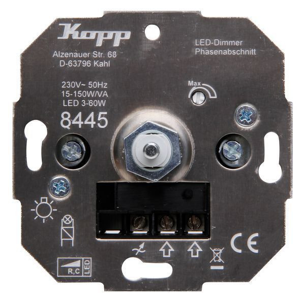 Druck-Wechselschalter LED Dimmer, für Glüh- und 230V Halogenlampen, dimmbare LED´s, für NV-Halogenlampen mit elektronischen Trafos, einstellbare Grundhelligkeit, mit Softrastung, Welle 4mm, Phasenabschnitt RC 15-150W/VA, LED 3-50W, mit Befestigungsmutter und Wellenadapter