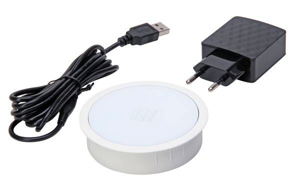 VersaCHARGER zum induktiven Laden von Smartphones, Ausführung: Ring weiß - Fläche weiß, inkl. Netzstecker und 2 Meter Anschlußkabel (USB A auf USB B Micro), Bohrung 80mm, Eingang 5V (DC) 2A, Ausgang 5V (DC) 1A, Gesamtausgangsleistung 5 Watt, IP20