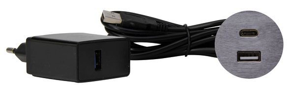 VersaPICK (metall) , USB Einbauset mit 1x USB-A und 1x USB-C Anschluss, mit ca. 2 m USB-A Anschlusskabel und Netzadapter (max. 18W), Ausführung: rund, Farbe:edelstahl