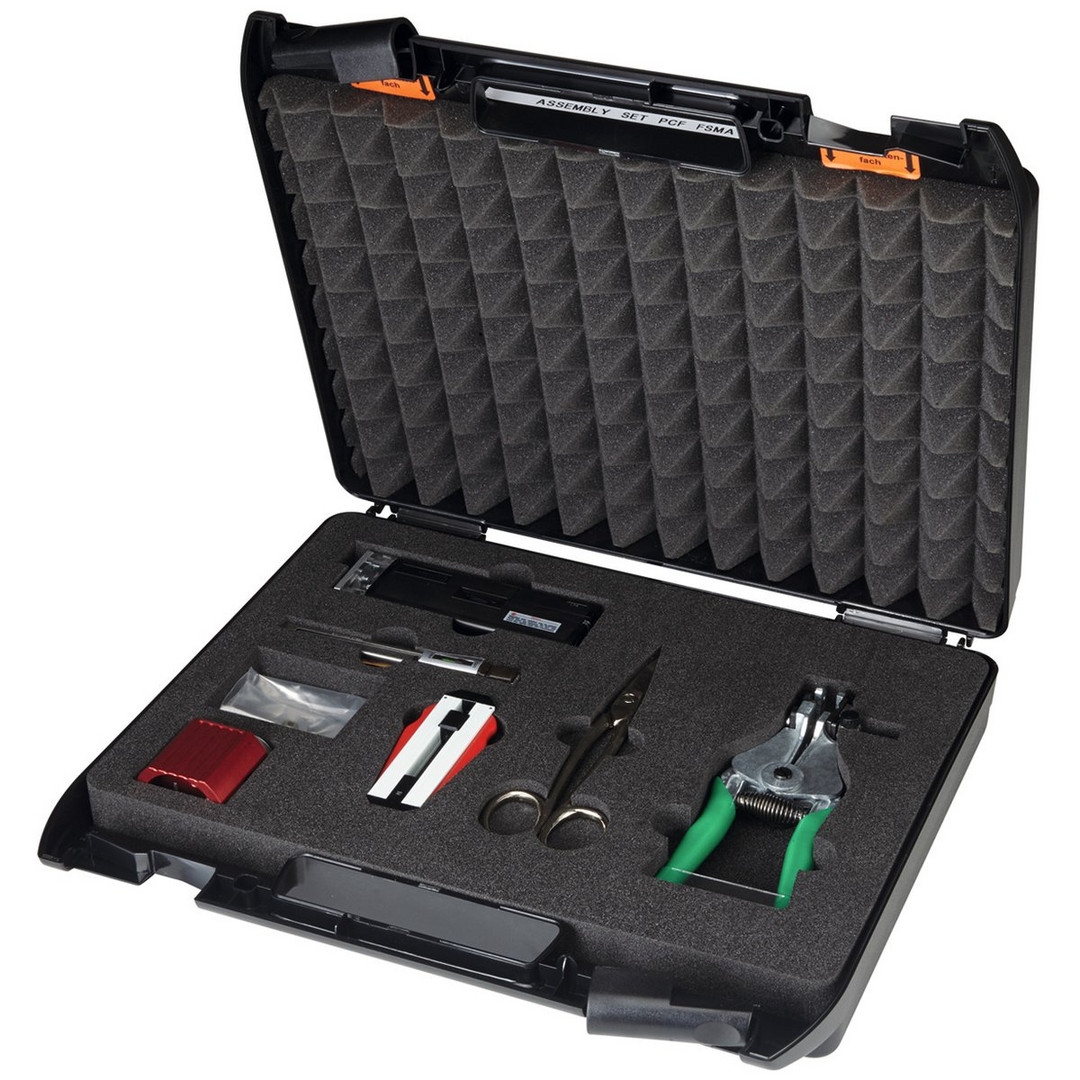 Einfache Handhabung, Set beinhaltet alle benötigten Werkzeuge zur Steckerkonfektion von Klemm-Stecker-Ausführungen, Geeignet für Vor-Ort-Konfektion, Inhalt: Abmantel- und Faserritzwerkzeuge, Kevlarschere, Messer, Mikroskop, Sets verfügbar für PCF-Klemm-Steckertypen FSMA, ST(BFOC), SC und HFBR4521,