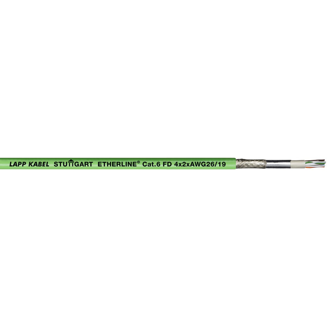 Ethernet-Leitung ETHERLINE® FD P CAT.6 4X2XAWG26; Ethernet-Leitung; Schleppkette, flexibel; EtherCAT, ETHERNET/IP; Cat.6; SF/UTP; PUR; Halogenfrei; grün; Anwendungsgebiete: Auch für EtherCAT- und EtherNet/IP-Anwendungen geeignet;Leitungsaufbau erlaubt flexiblen, dauerbewegten Einsatz in beweglichen Maschinenteilen und in der Schleppkette;PUR-Außenmantel hält hohen mechanischen Belastungen stand;PUR-Außenmantel ist unempfindlich gegenüber mineralölbasierten Schmiermitteln und vielfach chemisch beständig;Einsetzbar in trockenen, feuchten und speziell in rauen und öligen Umgebungen; Nutzen: Cat6-Performance bis 1 Gbit/s;UL-Zertifizierung gemäß Technischen Daten ermöglicht Verwendung des Produkts im nordamerikanischen Raum;Hochflexibler Leitungsaufbau mit Trennkreuz zum Schutz der Aderpaare für maximale mechanische Beanspruchung;Langlebiges, unempfindliches Produkt, dank abrieb-, kerb- und schnittfestem PUR-Außenmantelmaterial;Schneller Informationsaustausch durch Ethernet-Technologie ;Erfolgreich getestet auf über 4 Mio Biegezyklen in der Schleppkette ;Idealer Schutz vor elektromagnetischer Störung durch doppelte Schirmung aus aluminiumkaschierter Folie und Kupferabschirmgeflecht mit hohem Bedeckungsgrad (SF/UTP)