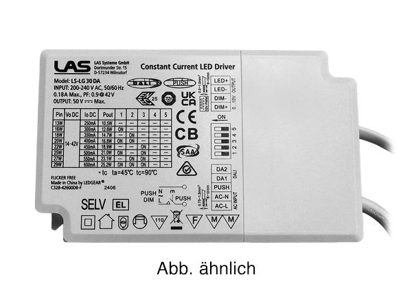 | Kurzbeschreibung | Treiber für LAS Panels - Wattage via DIP - Dim. via DALI, 0-10V, Push - 220-240V AC - 250-600mA - 14-42V DC - inkl. AC u. DC Anschluss - EL-Konform |