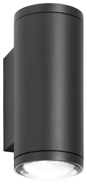 Up und Down Wandleuchte Typ 5156, zweiseitiger Lichtaustritt mit Abstrahlwinkel 100°/100°, pulverbeschichtete Leuchte (graphit) aus Aluminium-Druckguss, Diffusor Lupenglas, inklusive LED-Leuchtmittel. Kabeleinführung 2-fach, mit Feuchtigkeitsausgleichsventil, 2x LED 9 Watt, 3000K/4000K/5000K, 1150-2700 lm, CRI90, dimmbar, Höhe 200 mm, Breite 76 mm, Wandabstand 93 mm, Schutzart IP65, Spannung 220-240 V, 50/60 Hz