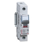 Legrand Lasttrennschalter DX3, 1-polig, 63A 250 VAC, nach EN 60947-3, EN 60669-2-4. Gebrauchskategorie AC-22A. Befestigung auf Hutprofilschiene EN 60715 durch rastende Schnellbefestigungen, klare Information vorne auf jedem Gerät, eindeutige Schaltstellungsanzeige rot/grün am Schalthebel (verriegelbar), mit Beschriftungsfenster, einpolig verschienbar mit Legrand Stiftkammschienen, Anbau von Hilfsgeräten möglich.