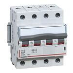 Legrand Lasttrennschalter DX3, 4-polig, 40A 400 VAC, nach EN 60947-3, EN 60669-2-4. Gebrauchskategorie AC-22A. Befestigung auf Hutprofilschiene EN 60715 durch rastende Schnellbefestigungen, klare Information vorne auf jedem Gerät, eindeutige Schaltstellungsanzeige rot/grün am Schalthebel (verriegelbar), mit Beschriftungsfenster, einpolig verschienbar mit Legrand Stiftkammschienen, Anbau von Hilfsgeräten möglich.