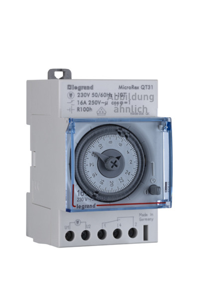 Legrand MicroRex QT31, analoge Tageszeitschaltuhr mit Quarzmotor (Ganggenauigkeit +/- 2,5 Sek/Tag, Gangreserve 100 Std.), für den Verteilereinbau, 1 Kanal, Betriebsspannung 120 V 50/60 Hz, mit Handschalter: EIN-Automatik-AUS, mit unverlierbaren Schaltsegmenten, Zeiger vorwärts und rückwärts drehbar, dadurch sehr leichte Einstellung von z.B. Sommer- und Winterzeit, Deckel plombierbar, kürzeste Schaltzeit: 30 Min.. Schaltausgang: 1 Wechsler.