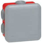 Legrand Abzweigdose Plexo. Quadratisch 80 x 80 x 45 mm (H x B x T), Schutzart IP 55 – IK 07, mit 7 Vorprägungen für metrische Leitungseinführung, Deckel zum aufschnappen, Rot RAL 3000/Grau RAL 7037, zur Kennzeichung von Sicherheitsbeleuchtungsstromkreisen gemäß DIN VDE 0105, selbstverlöschend 960°C, beschriftbarer Deckel.
