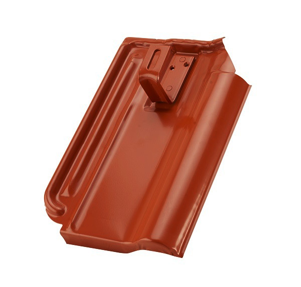 Aufdachmodulhalter auf Metalldachplatte genietet, Flachdachpfanne, komplett mit Lattenschiene 400 mm, inklusive Bohrschrauben, zum Anschrauben an die Dachkonstruktion, ziegelrot