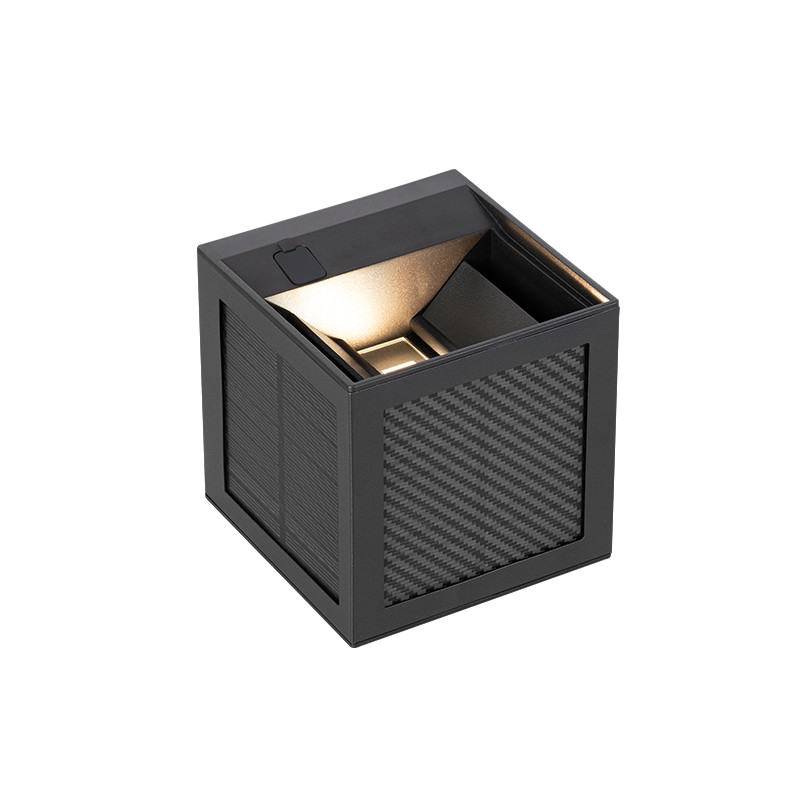 Solar-Wandleuchte Serie SOPHIE, mit Solarpanel für kabellose Wandmontage, mit speziell gestaltetem Solarpanel, das sich elegant in das Produktdesign einfügt, drei Betriebsmodi für flexible Anwendung in unterschiedlichen Einsatzbereichen, leicht entnehmbar und einfach über USB-C oder Solar wieder aufladbar, mit Bewegungsmelder und Tageslichtsensor, Lichtfarbe in 3000K/4000K/5000K mit DIP-Schalter einstellbar, Gehäusematerial: Aluminium, Gehäusefarbe: Schwarz RAL9004, Maße: 100x100x100mm, Gewicht: 0,45kg, Leistung: 9W, Lichtstrom: max. 300lm, Abstrahlwinkel: oben und unten 0°-120° einstellbar, Schutzart: IP65, Stoßfestigkeitsgrad: IK03, Bewegungsmelder: Radar 4±2 Meter, Tageslichtsensor: Aktivierung bei 15LUX, mit Akku 2600mAh 3.7V Li-ion, Solarpanel: 5V 150mA