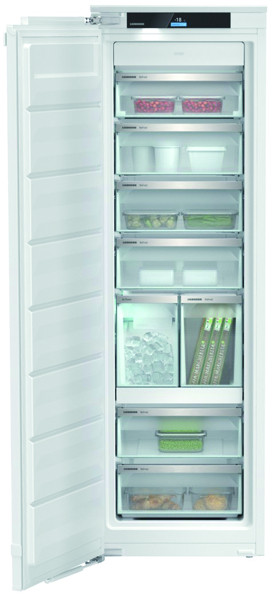 2,4" TFT-Display farbig hinter der Tür, Touch- & Swipe, SuperFrost, NoFrost Abtauautomatik, Alarm bei Störung optisch und akustisch, Türalarm optisch und akustisch, EnergySaver, SabbathMode, PartyMode, Displaysperre, inkl. SmartDeviceBox, LED-Beleuchtung, 8 Schubfächer, davon 5 mit Teilauszug auf Teleskopschienen, Gefriertablett, VarioSpace durch herausnehmbare Schubfächer und Glaszwischenböden, IceMaker mit Beleuchtung und Festwasserschlauch mit WaterStop, ca. 0,8 kg Eiswürfel/24 Std., Eiswürfelvorrat 5,7 kg, Türanschlag links, wechselbar, Schließdämpfung, Seitenwandheizung beidseitig, geeignet für Kombination mit anderen Kühl-, Gefrier- und/oder Weingeräten