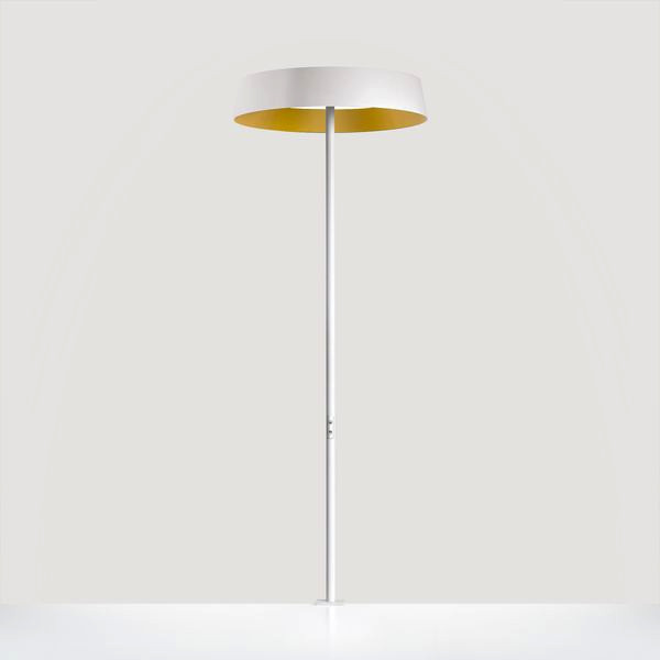 Beam Me Up-T1. LED. Design-Tischleuchte mit rückversetzter Optik und dekorativem Reflektorring. Leuchtenschirm aus hochwertig verarbeitetem Fiberglas. Oberfläche Snow White. Lichtcharakteristik: Direkt-/ indirektstrahlend. Farbtemperatur: 3000K (Warm White). Farbwiedergabeindex (Ra): >80. Microprismenoptik aus Spezialacrylglas zur Reduktion der Leuchtdichte in Office-Bereichen. UGR<=19. Reflektor: Satin Gold. Getrennt stufenlose Dimmung der Lichtkammern direkt/indirekt. DxH (Leuchtenkopf, rund/Mast). D=450mm. H=90/1200mm. Medium-Power-Bestromung. 8462lm. 74W. 7,4kg. Binning initial <= MacAdam 3. Tischklammer passend zur Leuchtenfarbe lackiert. Stecker Schuko CEE 7/7 (Type E+F). IP20. Schutzklasse I. CE-, UKCA Kennzeichnung. IK02. 220-240V. 50-60 Hz. Lichtstromrückgang von max. 0,3%/1.000 Betriebsstunden. Nennausfallrate von max. 0,2%/1.000 Betriebsstunden. L85B10 (tq 25°C) = 50.000h. 5 Jahre Garantie. Hersteller: Lightnet GmbH, nach ISO 9001:2015 und 50001:2018 zertifiziert.