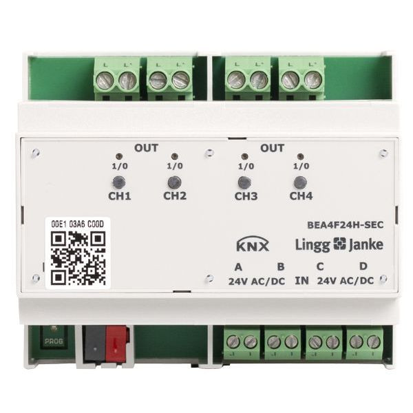 KNX eco+ Binär Ein-/Ausgang 4-fach Signaleingang 24V AC/DC Handbedienung 6 TE Schaltleistung 16A 250 VAC C-Last 200µF