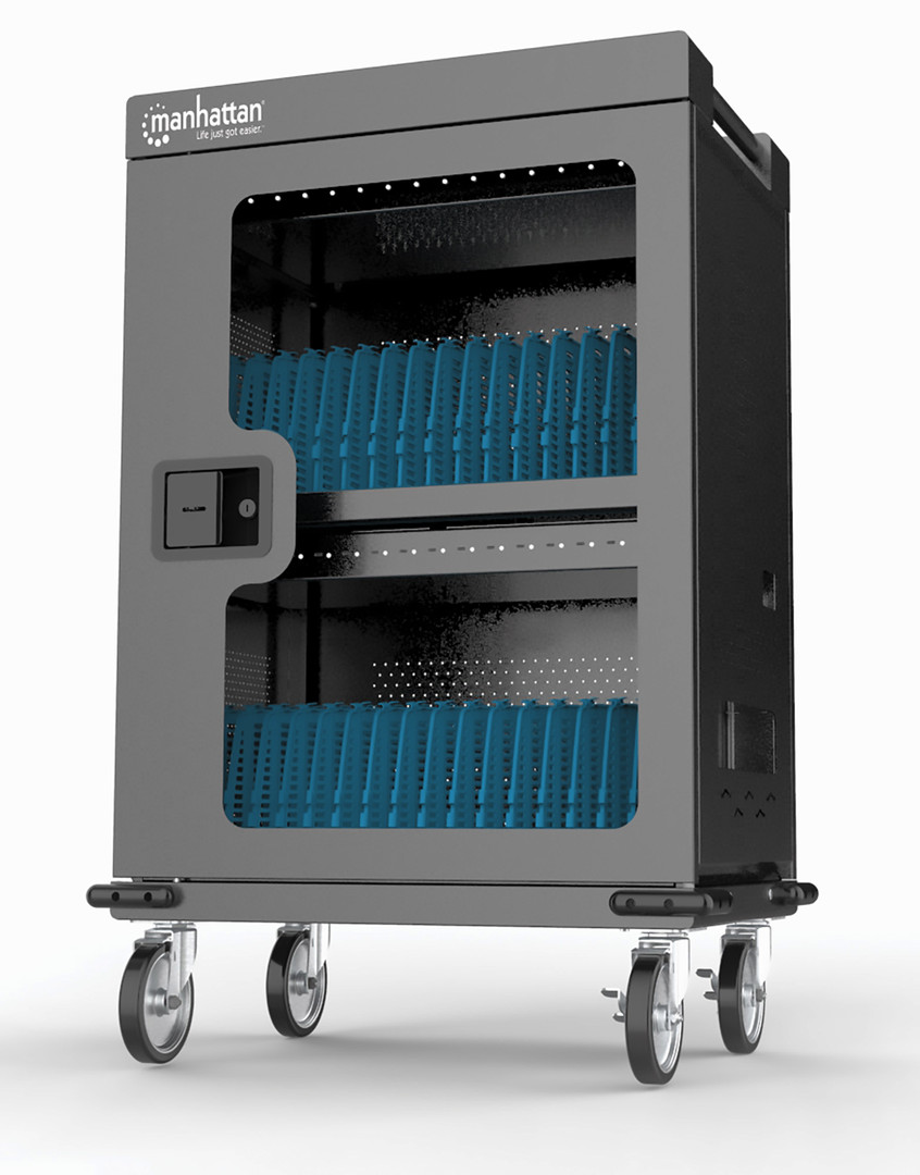 Sicherer Lagerplatz und Ladestation für 32 Chromebooks, Tablets, Smartphones und andere USB-Geräte bis zu 15,6" USB-C Power Delivery (PD 3.0) Ladeports mit Ausgangsleistung bis zu 18 W/3 A pro Port und 576 W gesamt Schutz vor Überladung, Überspannung, Kurzschluss, Spannungsspitzen und Blitzschlag Stahltür mit Sichtfenster aus Sicherheitsglas auf der Frontseite Status-LEDs für einfache Übersicht Robustes, sicheres, pulverbeschichtetes Metallgehäuse, 3-Punkt-Schloss an Front, zwei beiliegende Schlüssel Geräumige Trennfächer [jeweils 404 (T) x 27,6 (B) x 283 (H) mm] mit integrierten Kabelführungen Integrierter Lüfter und perforierte Seitenwände für effiziente Kühlung und maximalen Luftdurchsatz Robuster Griff und vier Rollen mit hoher Traglast (nicht abnehmbar) Abgerundete Ecken vermeiden Verletzungen in hektischen Umgebungen Erdungskit im Lieferumfang Universeller C14-Stromanschluss, C13 auf CEE 7/4 EU-Stromkabel im Lieferumfang, kann bei Bedarf durch regionale Versionen ausgetauscht werden Ideal zur Verwendung mit Manhattan USB-C-Ladekabeln, z. B. #356213 oder #354868 3 Jahre Garantie