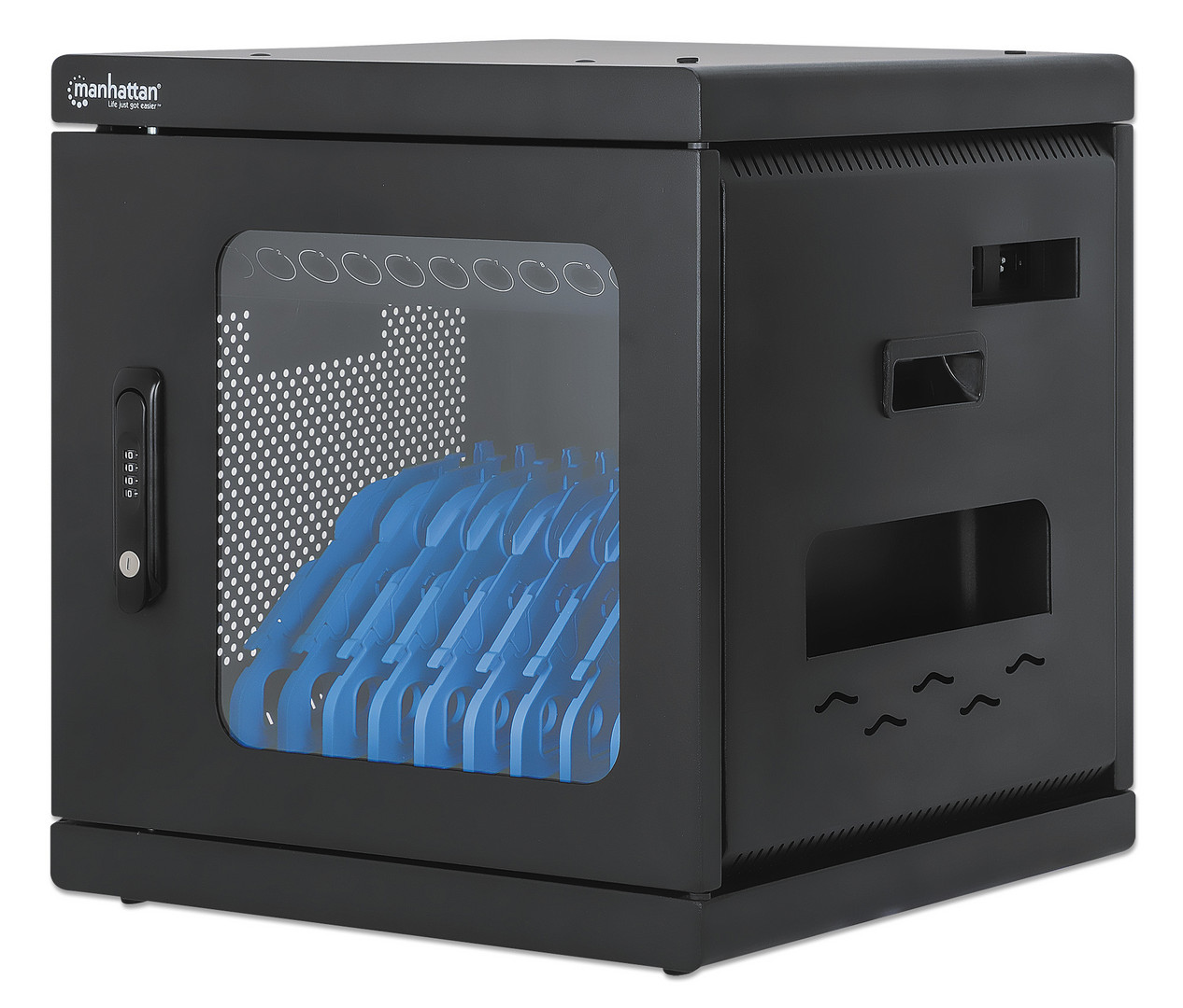 Sicherer Lagerplatz und Ladestation für Laptops und andere Geräte bis zu 15,6" Zehn EU CEE 7/3-Steckdosen in Steckdosenleisten unter der Oberseite montiert Schutz vor Überladung, Überspannung, Kurzschluss und Spannungsspitzen Stapelbar mit zwei Einheiten für eine noch umfangreichere Ladelösung mit mehr Steckdosen (benötigt vier M8 25 mm-Schrauben, nicht im Lieferumfang) Integrierte Wandmontagelöcher auf der Rückseite ermöglichen diebstahlsichere und platzsparende Installation, Montagematerial vollständig im Lieferumfang Robustes, sicheres, pulverbeschichtetes Metallgehäuse, 3-Punkt-Schloss an Frontseite, abschließbar mit zwei beiliegenden Schlüsseln oder vierstelliger Zahlenkombination Sicherheitsglastür auf der Frontseite, öffnet 270°, Türanschlag links und rechts einsetzbar Geräumige Trennfächer (jeweils 400 x 29 x 282 mm) mit integrierten Kabelführungen Integrierter Lüfter und perforierte Seitenwände für effiziente Kühlung und maximalen Luftdurchsatz Abgerundete Ecken vermeiden Verletzungen in hektischen Umgebungen Erdungskit im Lieferumfang Gummifüße für rutschfesten Einsatz auf allen Oberflächen Universeller C14-Stromanschluss, Stromkabel mit C13 auf EU-Stecker im Lieferumfang Keine Ladegeräte oder Ladekabel im Lieferumfang (separat erhältlich von Manhattan) 3 Jahre Garantie