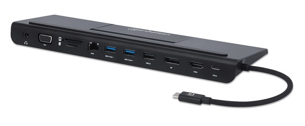 Multifunktionale Dockingstation zum Anschluss eines USB-C-Geräts an HDMI-, DisplayPort und VGA-Displays gleichzeitig, zwei USB 3.2 Gen 1 Typ-A-Ports, ein USB 2.0 Typ-A-Port, ein 10/100/1000 Mbit/s RJ45-Port, eine 3,5 mm-Klinkenbuchse, ein USB-C-Stromport und ein SD-Kartenleser Zweifache Videoausgabe mit Auflösungen bis zu 1080p@60Hz oder dreifache Videoausgabe mit Auflösungen bis zu 720p@60Hz Bis zu 4K@30Hz-Auflösung (UHD) über HDMI-Anschluss Bis zu 4K@30Hz-Auflösung (UHD) über DisplayPort-Anschluss Bis zu 1080p@60Hz-Auflösung (Full HD) über VGA-Anschluss Anzeigemodi Gespiegelt und Erweitert mit Multi-Steam Transport (MST) Ermöglicht die Verwendung Ihres Smartphones als Desktop-PC* und lädt gleichzeitig dessen Akku Ein Gigabit Ethernet-Port (10/100/1000 Mbit/s) für Downloads, Streaming und Gaming in Highspeed Zwei USB 3.2 Gen 1 und ein USB 2.0 Typ A-Ports zum Anschluss von Maus, Tastatur, USB-Stick und mehr oder zum Laden und Synchronisieren von mobilen Geräten USB-A SuperSpeed-Ports bieten Übertragungsraten bis zu 5 Gbit/s und unterstützen BC1.2 zur Geräteladung mit 7,5 W (5 V / 1,5 A) MicroSD- und SD-Kartenslot mit Lese-/Schreibfunktion; unterstützt automatische Kartenerkennung und Übertragungsraten bis zu 832 Mbit/s USB-C Power Delivery (PD) Port (benötigt ein PD-Netzteil mit mindestens 15 W Ausgangsleistung) liefert bis zu 100 W (20 V bei 5 A) an verbundene Geräte Unterstützt USB Power Delivery-Funktion (PD) mit bis zu 100 W; benötigt externes PD-Ladegerät - erhältlich von Manhattan 3,5 mm-Klinkenbuchse für hochwertigen Stereosound; unterstützt sowohl Mikrofon (Audioeingang) als auch Kopfhörer (Audioausgang) Robustes Aluminiumgehäuse ideal für den Schreibtisch und für unterwegs Ausklappbarer Ständer zur Platzierung Ihres Smartphones auf der Dockingstation Kompatibel mit allen USB-C DP-Alt-Mode-unterstützten PCs, Notebooks und Tablets, einschließlich Apple MacBook®, Chromebook™, Pixel™ und mehr Kompatibel mit DisplayPort 1.2 Alternate Mode (DP Alt Mode) Vollständig geschirmt zur Reduzierung elektromagnetischer Interferenzen und anderer Störquellen Robustes Kabel mit vergossener PVC-Tülle und schützender Nylonummantelung Plug & Play *Desktop-Anzeige erfordert Geräte mit Android 9 oder höher mit Videoausgabe über USB-C 3 Jahre Garantie