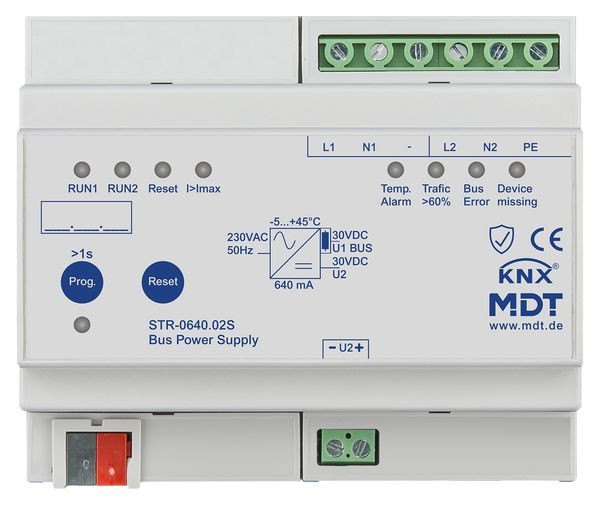 KNX Redundante Busspannungsversorgung mit Diagnose, 6TE REG, 640 mA, Secure. Ausführung mit Nennstrom 640 mA. Redundante Busspannungsversorgung zur Erhöhung der Betriebssicherheit. KNX Data Secure. KNX Busspannungsversorgung mit integrierter Drossel. Zwei integrierte Spannungsversorgungen zur Redundanz. Versorgungsspannung 2 x 230 V AC (getrennte FI Kreise möglich). Nennstrom 640 mA, Dauerstrom 900 mA, Spitzenstrom 1200 mA. Bei Ausfall einer Netzspannung oder eines internen Netzteiles bleibt die KNX Busspannung über das zweite Netzteil erhalten. Ausfallmeldung über Telegramm. Kurzschlussfest. Überlastsicher. Zusätzlicher unverdrosselter Ausgang U2. Integrierter Busankoppler mit Diagnosefunktionen:. Busspannung, Busstrom, Busüberlast. Netzspannungsausfall/-wiederkehr. Alle Ereignisse werden mit Zeitstempel im Ringspeicher abgelegt. Auslesen des Ringspeichers über 14 Byte Telegramm. Sicherheitsfunktion zur Erkennung eines Geräteausfalls in der Linie. 3 Jahre Produktgarantie.