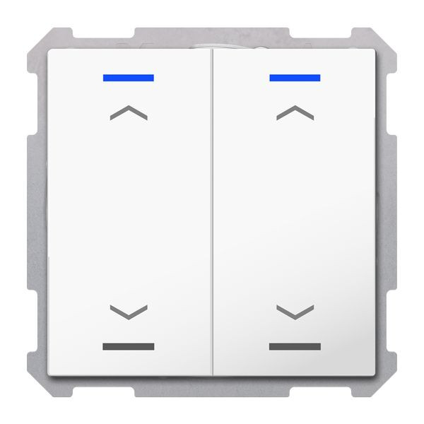 KNX Taster Light 63 2-fach, RGBW, Studioweiß glänzend, Jalousie, Secure. Ausführung Auf/Ab Symbol mit 2 Tastenpaaren / 4 Tasterflächen. KNX Data Secure, integrierter Busankoppler. Passend für 63 mm Schalterprogramme, z. B. MDT Sortiment 63 oder Busch-Jaeger future linear, solo, carat und Busch-axcent. Die Tasten sind als Tastenpaar oder Einzeltasten frei einstellbar. Intelligentes Ein-Tasten-Dimmen. Erweiterte Funktion "Werte senden". Ein- und Zweitasterbetrieb für Schalten, Dimmen, Jalousie, Werte. Umschalten von bis zu vier Werten oder Szenen. Kurzer/Langer Tastendruck mit 2 Objekten. Innovative Gruppensteuerung mit langem/extra langem Tastendruck. Mehrfach-Tippfunktion sendet bis zu 4 Werte auf gleiche oder verschiedene Objekte. Zwei RGBW Status-LEDs pro Tastenpaar. LED Helligkeit über Tag/Nacht- oder Helligkeit-Objekt steuerbar. 4 Logikblöcke. Einbau in Schalterdose mit mitgeliefertem Tragring. 3 Jahre Produktgarantie.