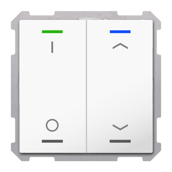 KNX Taster Light 63 2-fach, RGBW, Studioweiß glänzend, Schalten_Jalousie, Secure. Ausführung I/O und Auf/Ab Symbol mit 2 Tastenpaaren / 4 Tasterflächen. KNX Data Secure, integrierter Busankoppler. Passend für 63 mm Schalterprogramme, z. B. MDT Sortiment 63 oder Busch-Jaeger future linear, solo, carat und Busch-axcent. Die Tasten sind als Tastenpaar oder Einzeltasten frei einstellbar. Intelligentes Ein-Tasten-Dimmen. Erweiterte Funktion "Werte senden". Ein- und Zweitasterbetrieb für Schalten, Dimmen, Jalousie, Werte. Umschalten von bis zu vier Werten oder Szenen. Kurzer/Langer Tastendruck mit 2 Objekten. Innovative Gruppensteuerung mit langem/extra langem Tastendruck. Mehrfach-Tippfunktion sendet bis zu 4 Werte auf gleiche oder verschiedene Objekte. Zwei RGBW Status-LEDs pro Tastenpaar. LED Helligkeit über Tag/Nacht- oder Helligkeit-Objekt steuerbar. 4 Logikblöcke. Einbau in Schalterdose mit mitgeliefertem Tragring. 3 Jahre Produktgarantie.