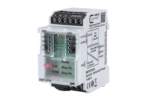 Der BMT-RTR/SC ist ein kompakter Router für den bidirektionalen Datenaustausch zwischen BACnet/IP und BACnet MS/TP Feldbusgeräten. Er unterstützt die verschlüsselte Datenkommunikation BACnet/SC (Secure Connect) als BACnet/SC Node mit den Routing Funktionen: Routing von BACnet MS/TP auf BACnet/SC, von BACnet/IP auf BACnet/SC und von BACnet MS/TP auf BACnet/IP. Über zwei 4-polige Anschlussklemmen auf der Frontseite des Geräts sowie einem Brückenstecker kann der BMT-RTR/SC an METZ CONNECT BACnet MS/TP Geräte angeschlossen werden. Ein integrierter Webserver dient zur Parametrierung, Verwaltung und Überwachung der beiden Schnittstellen (Ethernet / RS485). Das Webinterface wird auch zum Aktualisieren der Firmware verwendet. Der BMT-RTR/SC ist für die dezentrale Montage in Elektrounterverteilern oder in Schaltschränken auf Tragschiene TH35 nach IEC 60715 geeignet. Anschluss mit Schraubklemmen, Zugriff auf 32 Geräte am BACnet MS/TP Bus, Bidirektionaler Datenaustausch zwischen BACnet/SC, BACnet/IP und BACnet MS/TP Geräten, Protokolle: BACnet MS/TP, BACnet/IP, BACnet Ethernet, HTTP 1.0, BACnet/SC, Integrierter Webserver, Intuitive und softwareunabhängige Konfiguration über die Weboberfläche, Aufzeichnung und Analyse der IP und RS485 Kommunikation, Einfache Gerätesuche von METZ CONNECT BACnet MS/TP Geräten am RS485-Bus, Schneller Anschluss von METZ CONNECT BACnet MS/TP Geräten über bewährte Brückensteckertechnologie