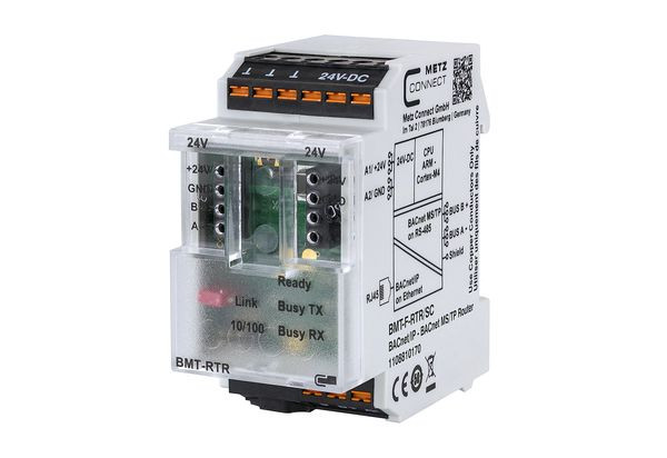 Der BMT-F-RTR/SC ist ein kompakter Router für den bidirektionalen Datenaustausch zwischen BACnet/IP und BACnet MS/TP Feldbusgeräten. Er unterstützt die verschlüsselte Datenkommunikation BACnet/SC (Secure Connect) als BACnet/SC Node mit den Routing Funktionen: Routing von BACnet MS/TP auf BACnet/SC, von BACnet/IP auf BACnet/SC und von BACnet MS/TP auf BACnet/IP. Über zwei 4-polige Anschlussklemmen auf der Frontseite des Geräts sowie einem Brückenstecker kann der BMT-F-RTR/SC an METZ CONNECT BACnet MS/TP Geräte angeschlossen werden. Ein integrierter Webserver dient zur Parametrierung, Verwaltung und Überwachung der beiden Schnittstellen (Ethernet / RS485). Das Webinterface wird auch zum Aktualisieren der Firmware verwendet. Der BMT-F-RTR/SC ist für die dezentrale Montage in Elektrounterverteilern oder in Schaltschränken auf Tragschiene TH35 nach IEC 60715 geeignet. Anschluss mit Federkraftklemmen (Push-In), Zugriff auf 32 Geräte am BACnet MS/TP Bus, Bidirektionaler Datenaustausch zwischen BACnet/SC, BACnet/IP und BACnet MS/TP Geräten, Protokolle: BACnet MS/TP, BACnet/IP, BACnet Ethernet, HTTP 1.0, BACnet/SC, Integrierter Webserver, Intuitive und softwareunabhängige Konfiguration über die Weboberfläche, Aufzeichnung und Analyse der IP und RS485 Kommunikation, Einfache Gerätesuche von METZ CONNECT BACnet MS/TP Geräten am RS485-Bus, Schneller Anschluss von METZ CONNECT BACnet MS/TP Geräten über bewährte Brückensteckertechnologie