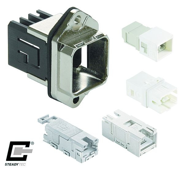 Flansch mit Push-Pull-Verschluss nach Norm ISO/IEC 24702 und IEC 61076-3-117 Var. 14, IP67 geschütztes Gehäuse zur Aufnahme der E-DAT Industry Flanscheinsätze, einfach zu montieren durch Normbefestigung mit zwei Schrauben (M3), nicht im Lieferumfang enthalten, frontseitig montierbar, industrietaugliches Metallgehäuse mit erhöhter Robustheit, Brennbarkeitsklasse nach UL 94V-0, bessere Chemikalienbeständigkeit, Erdung über Flachstecker 2,8 mm am RJ45-Einsatz möglich, passende Einsätze: E-DAT Industry RJ45 field jack insert (T568A, T568B oder Profinet), E-DAT Industry RJ45 coupler insert oder E-DAT Industry USB coupler insert