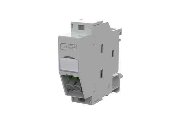 Anschlusseinheit zur Montage auf Tragschiene TH35 nach DIN EN 60715 in Elektroverteilern für Haus- und Industrieinstallation, neue METZ CONNECT IRT-FF Technologie, ohne Kunststofffolie verpackt (Installation ready technology ? foil free), bestückt mit einer OpDAT LC Duplex OS2 APC Kupplung, Steckrichtung 45° nach unten geneigt, die Baubreite von 1TE ermöglicht den Einbau von bis zu 12 REGplus in Standard-Elektroverteiler