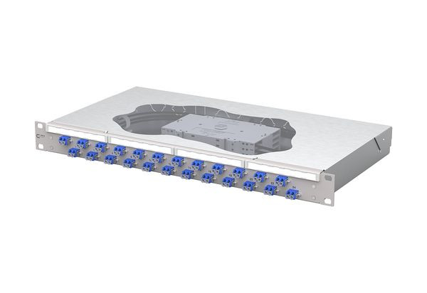 19 Zoll, 1HE Patchfeld zum Festeinbau, Bestückt mit 24xLC-D Kupplungen und 48xLC-D OS2 Pigtails, Versetzte Kupplungsanordnung für ein einfaches Handling, Pigtails in Standardspleißkassette mit Crimpspleißhaltern eingelegt und abgesetzt, Pigtail visuell geprüft und in Kupplungen eingesteckt, Farbcodierung nach IEC 60304, Frontplatte mit Beschriftungsfeld, Frontplatte pulverbeschichtet in grau RAL 7035, Werkzeugloses Öffnen des Deckels, Mehrere Kabeleingangsmöglichkeiten rückseitig: 6xM20; 2xM25; 2xVIK-Einbauausschnitte