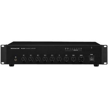 ELA-Mono-Mischverstärker, 3 Mikrofon-Eingänge, davon 1 symmetrischer Eingang, Mic 1 mit Vorrangschaltung und regelbarem Auto-Talkover, 2 Aux-Eingänge, 1 Telefon-Eingang für Telefonzentralen mit Audioausgang