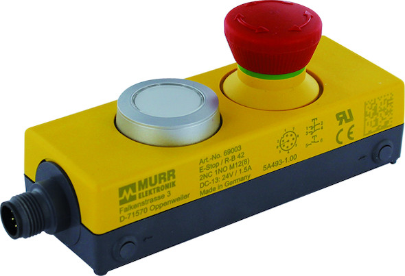 Not-Aus/Not-Halt-Taste mit 2 zwangsöffnenden Kontakten im IP65 Gehäuse Resettaster mit 1 beleuchtbaren Taste (1Schließer) M12 Anschluss, 8-pol.