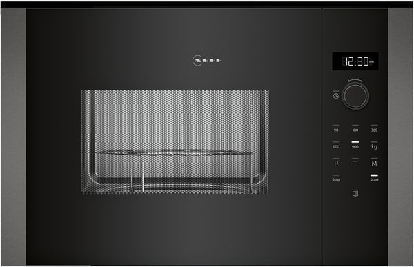 Mikrowelle und Heizart Max. Leistung: 900 W; 5 Mikrowellen-Leistungsstufen: 90 W, 180 W, 360 W, 600 W, 900 W Grill 1.2 kW Grill mit Mikrowellen-Leistungsstufen 90 W, 180 W, 360 W kombinierbar Mikrowelle und Grill einzeln und in Kombination nutzbar Garraumvolumen: 25 l Design Graphite-Grey Edition Garraum Edelstahl Reinigung Easy Clean (manuell) Komfort LED-Display Elektronik-Uhr Drehwähler, rund, Starttaste, LED Touch Control Steuerung, Voll versenkbare Bedienknebel Leicht-Bedien-Konzept: besonders einfaches, problemloses Einstellen 8 Stck 4 Auftau- und 3 Garprogramme im Mikrowellenbetrieb, 1 Programm für Kombinationsbetrieb Memoryfunktion für individuelle Programme (1 Speicherplatz) LED-Innenbeleuchtung 31.5 cm Glas-Drehteller Tür links angeschlagen Elektronische Türöffnnung Bedienung über Sensortasten Umwelt und Sicherheit Automatische Sicherheitsabschaltung Türkontaktschalter Kühlgebläse Technische Info Länge des Anschlusskabels: 130 cm Gesamtanschlusswert Elektro: 1.45 kW Nennspannung: 220 - 230 V Zum Einbau in einen Hochschrank Maße Gerätemaße (HxBxT): 382 x 594 x 388mm Nischenmaße (HxBxT): 382 mm x 560 mm x 550 mm Um die technische und optische Kompatibilität zu gewährleisten, empfehlen wir Ihnen, Komplementär-Produkte innerhalb der Produktserie N50 zu wählen, um die bestmögliche Einbausituation Ihrer Einbaugeräte zu gewährleisten. „Maße und Einbauhinweise zu diesem Gerät gemäß technischer Zeichnung beachten“