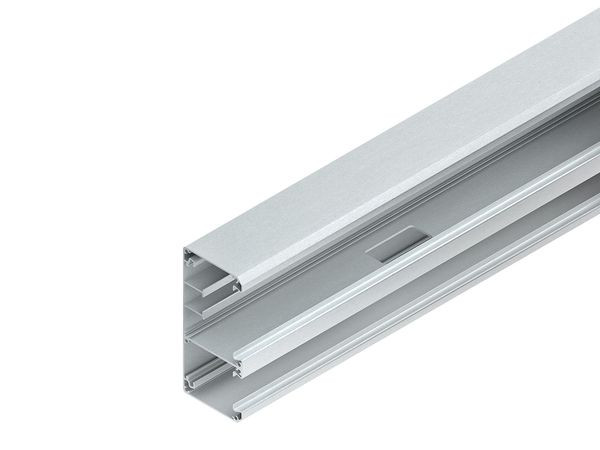 Doppelzügiges Gerätekanalunterteil, mit zwei mittels Trennprofil mit Kabeldurchführöffnungen getrennten, gleich großen Leitungszügen, mit einem durchlaufenden Aufnahmeprofil im oberen und unteren Leitungszug für die Einbeziehung in den Potentialausgleich mittels Potentialausgleichsbrücke GPB 63-2, durchlaufende Kerben als Bohrhilfe im Kanalrücken zur Montage auf Wand oder /-konsole, formschlüssige Verbindung an den Kanalstoßstellen mit Kupplungsstiften GKGS 4, Gerätemontage im Leitungszug mit einrastbarer Gerätedose, für Einbauprogramme mit 80 mm Abdeckrahmen und 60 mm Befestigungsspur, Geräteeinbau ohne Lochblenden, einschließlich jeweils 6 Kabelhalteklammern GKF... je 2 m Lieferlänge, Zubehör für den Potentialausgleich muss gesondert bestellt werden. VDE zertifiziert! Abmessungen (ca. Maße) H x T : 220 x 80 mm Deckelöffnung : 78 mm + 78 mm Oberfläche : naturanodisiert Lieferlänge L : 2000 mm Nutzbarer Querschnitt oberer Leitungszug : 7540 mm² Nutzbarer Querschnitt unterer Leitungszug : 7540 mm² Werkstoff : Aluminium