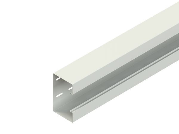 Gerätekanalunterteil, einzügig symmetrisch, mit Schlaufen und rückwärtiger Befestigungslochung zur flexiblen Montage auf Wand oder Wandkonsole, durchgehende Schlaufen zur Aufnahme von Trennprofilen im Rückenteil, Sichtflächen in RAL Farbton gemäß Herstellerkatalog elektrostatisch pulverbeschichtet, Gerätemontage im Leitungszug mit einrastbarer Gerätedose für Einbauprogramme mit 80 mm Abdeckrahmen und 60 mm Befestigungsspur, Geräteeinbau ohne Lochblenden, einschließlich 3 Kabelhalteklammern GKF 78 je 2 m Lieferlänge, für den Potentialausgleich zwei Stoßstellenverbinder GSVA... je Stoßstelle, bitte gesondert bestellen. VDE zertifiziert! Bei der Montage ist darauf zu achten, dass die Schlaufenöffnungen nach oben zeigen. Um einen festen Sitz des Deckels zu erzielen, müssen die Kabelhalteklammern GKF... im Abstand von 0,6 m - 0,7 m im Kanalunterteil eingesetzt werden. Abmessungen (ca. Maße) Höhe H x Tiefe T : 170 x 90 mm Deckelöffnung : 78 mm zweireihige horizontale Rückenlochung : 7 x 33 mm mittiger Lochabstand : 62,5 mm Reihenabstand : 75 mm vertikale Rückenlochung : 7 x 33 mm mittiger Lochabstand : 500 mm Schlaufenabstand RasterMaße : 250 mm Lieferlänge L : 2000 mm Nutzbarer Querschnitt : 14052 mm² Farbton : [Kundenangabe erforderlich] RAL : [Kundenangabe erforderlich] Werkstoff : Stahl, bandverzinkt nach DIN EN 10346