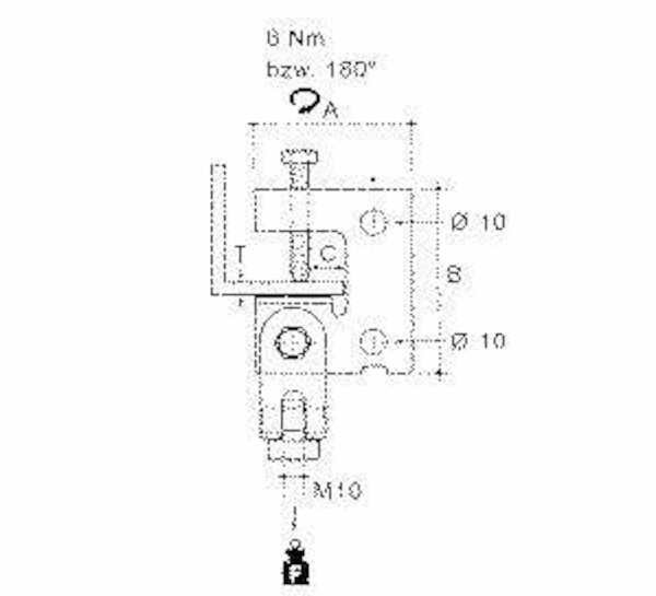 E-Klips, Schraubklemme mit Gelenk, zum Anschrauben an verschiedenste Trägerflansche. Abmessungen (ca. Maße) für Flanschstärke T : 1 - 25 mm Breite B x Höhe H (ohne Gelenk) : 60 x 71 mm Abstand Schraubklemme innen bis Klemmschraube C : 12 mm seitliche Befestigungslochungen : 2 x Ø 10 mm Gelenkgewindesanschluss : M 10 Tragfähigkeit F : 2 kN Werkstoff : Stahl, mechanisch verzinkt/passiviert nach DIN EN ISO 9227