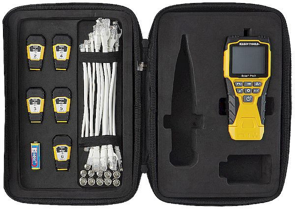 Scout™ Pro 3 Prüfgerät mit Test + Map™ Remote-Kit, prüft Sprach- (RJ11/12), Datenkabel (RJ45) und Video-Koaxialleitungen (F-Steckverbinder), erkennt und prüft Power-over-Ethernet (PoE), Prüfen des Verkabelungsplans, Prüfen auf Verdrahtungsfehler (Split Pairs, Kurzschluss, Unterbrechung und Abschirmung), misst Kabellängen bis 610 m (2000 Fuß), Orten von Kabeln sowie Paar- und Einzelleitern mit einem Mehrfachsignal-Tongenerator (erfordert analoge Sonde Kat. Nr. VDV500-123; separat erhältlich), enthält 1 selbstverstauende Test+Map Remote-Einheit (#1), 5 Test+Map Remote-Einheiten (#2-6), 7 Buchse-auf-Buchse-, 7 Stecker-auf-Buchse-Koaxial-Hohlstecker-Adapter, 7 RJ45 Überbrückungskabel (6 Zoll), 2 RJ11, 2 RJ12 Überbrückungskabel (6 Zoll), enthält eine 9 V-Batterie und eine praktische Tragetasche, Hub-Blinkmodus zum Identifizieren der Buchsenlage an einem Hub oder Schalter, beleuchtetes LCD Display zeigt Kabellänge, Leiterzuordnung, Kabel-ID und Testergebnisse an