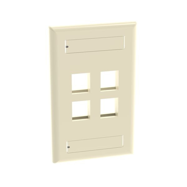 Die NetKey® Geräteblende nimmt vier Keystone-Module auf. Die Ein-Band-Geräteblende wird an einer NEMA-Standard-Ein-Band-Öffnung montiert. Geräteblende umfasst Etikett und Etikett-Abdeckung und ist Elektroweiß.